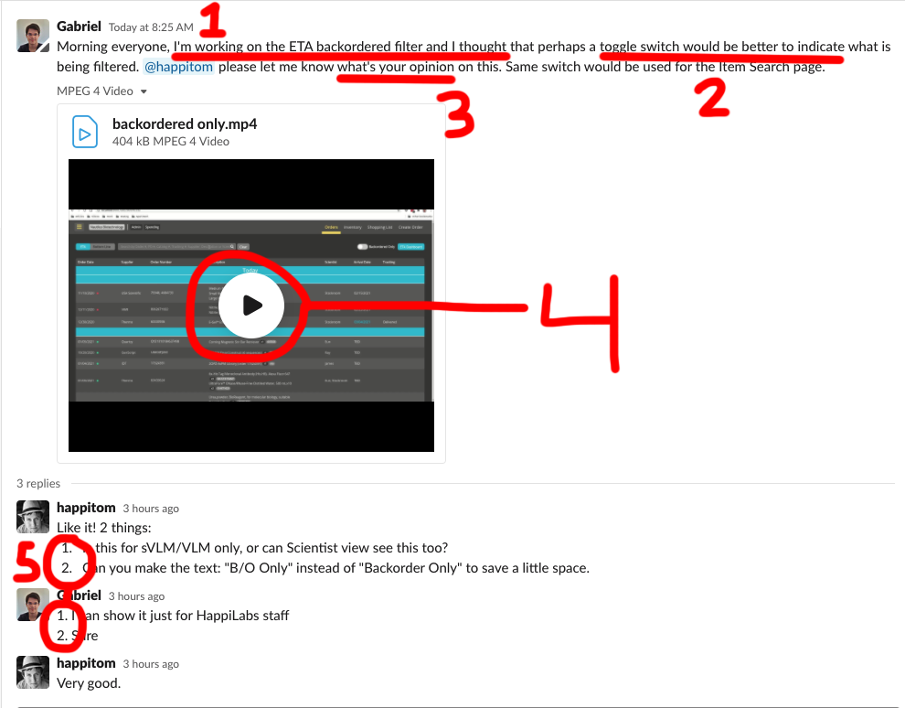 - “I’m working on the eta backordered filter and I thought” → Gabriel provides awesome context about what he is doing, without linking Tom to another card, or ticket or external something.