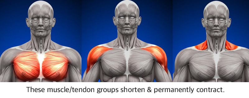 - Shortened tendons in the chest, neck and shoulders