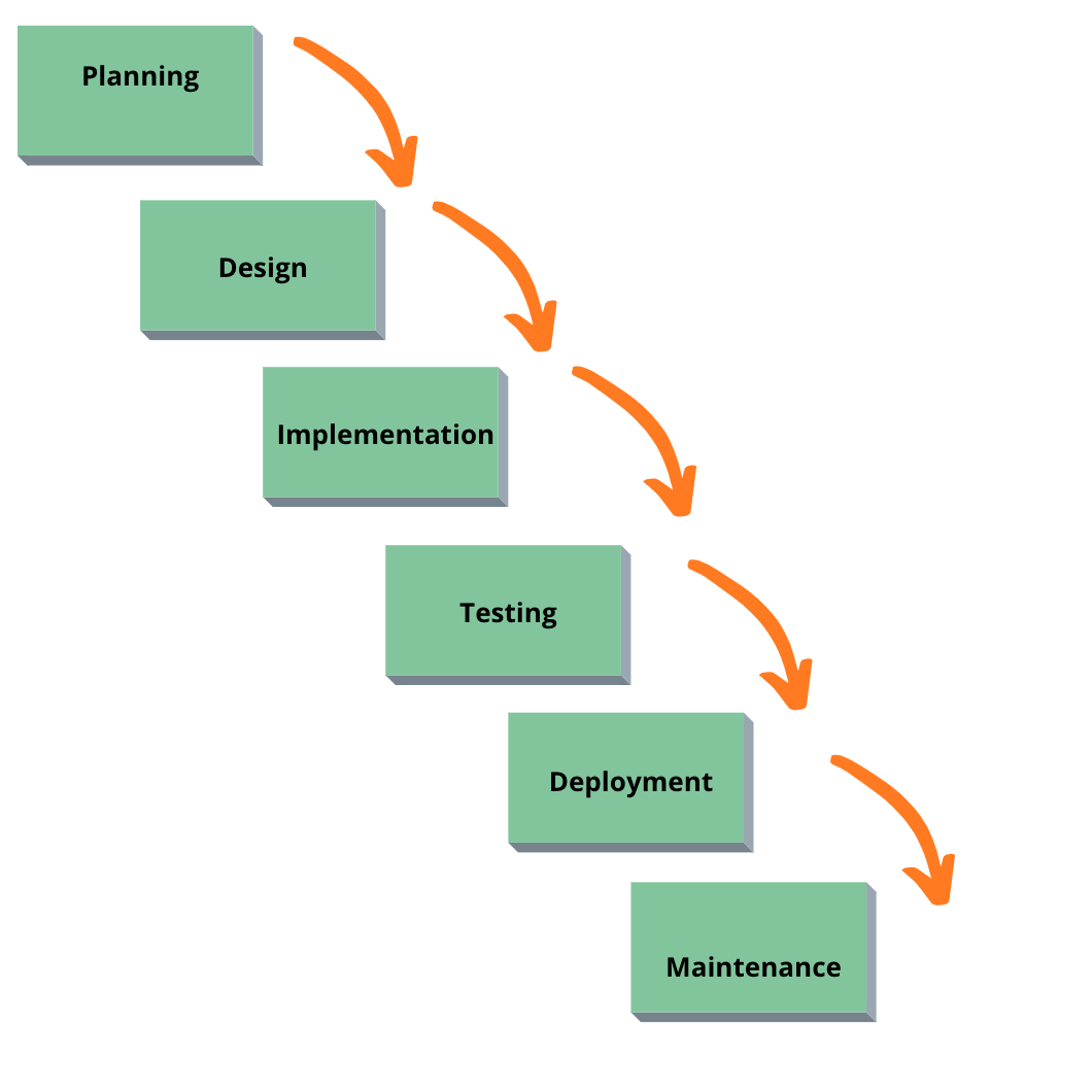 In the Waterfall model, the SDLC steps are completed in a sequential manner. Each stage only begins when all the deliverables of the previous phase are completed. Hence the name waterfall, because the progress is steadily flowing downwards.