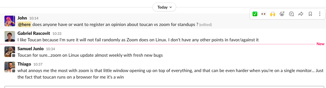 An if the video wasn’t enough for you, check out the below screenshot of some general developer feedback about using Toucan vs Zoom (I was actually shocked that everyone shared my sentiments as I’m usually the weird outlier)